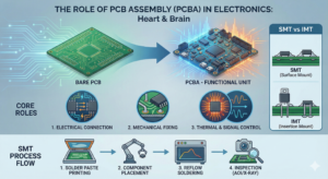 基板実装とは、英語でPCB Assembly(PCBA)と呼ばれ、絶縁体で作られたプリント基板(PCB)の上に、抵抗、コンデンサ、ICチップなどの電子部品を配置し、はんだ付けなどの手法で電気的に接続する工程を指します。