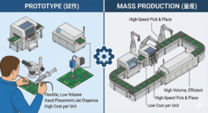 量産との最大の違いは、効率性よりも柔軟性と検証精度に重きを置いている点にあります。ジェットディスペンサーや汎用マウンターを駆使し、手作業でのチェックを交えながら、設計の不備を徹底的に洗い出します。