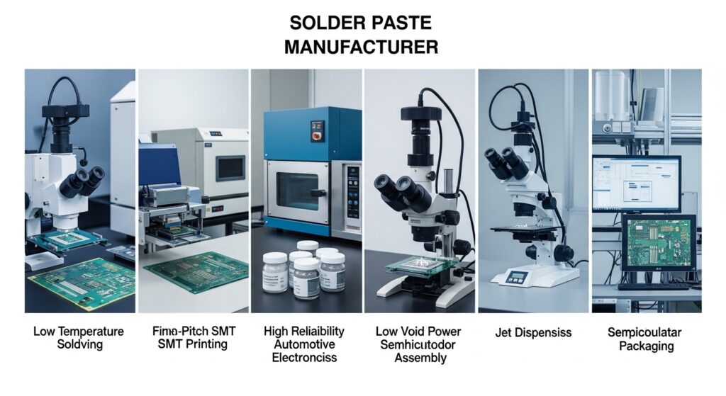 Indiumは半導体向けソルダーペースト群を広く持ち、低酸化粉末と多様なフラックス系を公開しています。